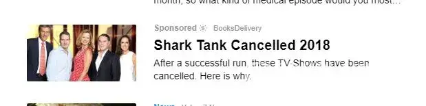 The advert is entitled BooksWays 'Why Dragons' Den Has Been Cancelled' although the titles morph across a variety of versions. The advert links to: