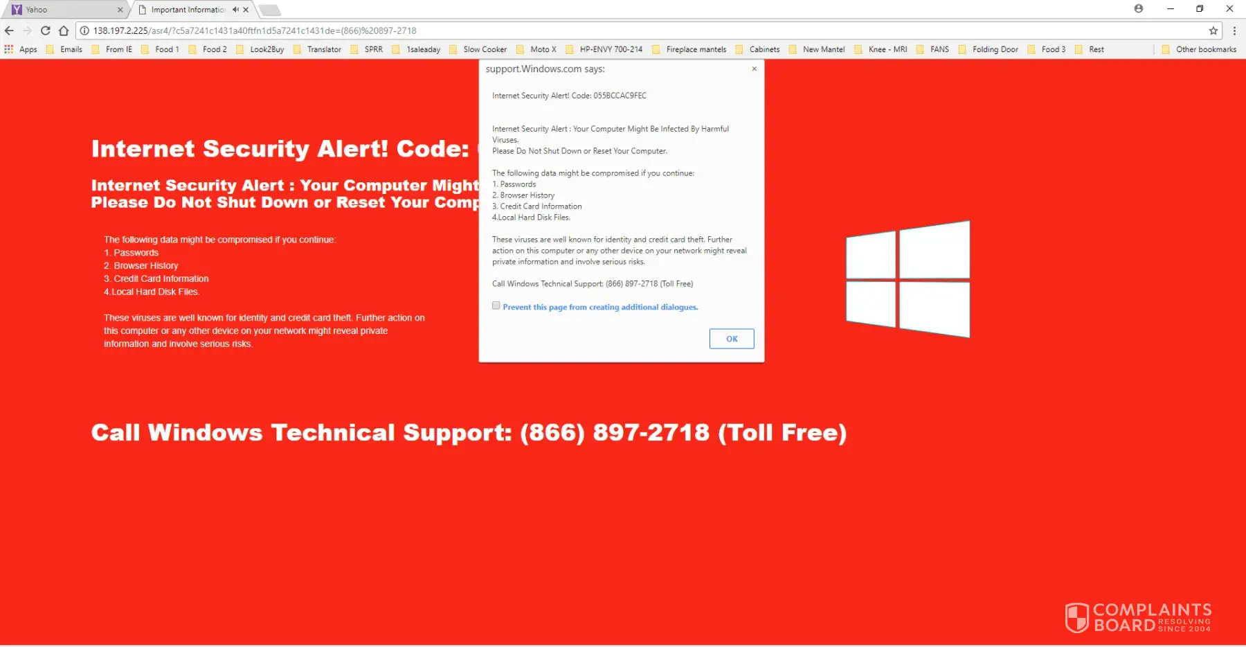 When I link off of your news articles, and this is happening more and more, instead of the feature opening, I get this webpage that may or may not lock my ability to close it. At the top it says: "internet security alert! Code... Then has a box to the side saying that my computer may be infected by harmful viruses. Do not shut down my or reset your computer. It gives a phone number to call for windows technical support: [protected]. Sometimes I can"x" out of the tab and sometimes not. When I can't I just power off my computer, wait, and then power back up again. I then run my virus and my malware checkers. A friend in newcastle, ca, a friend in minnesota, a friend in syracuse all have gotten this and they were all on yahoo news feeds. I told them to just power off the computer, etc. As I mentioned, this is happening more and more on your webpage and hackers have gotten into your system. Please see attachment of their webpage. I am sure when called, they will want money to release your browser. This scamming is not a good reflection upon yahoo. But myself, I am getting tired of it to where I want to switch news feeds, possible to msn or aol. I hope you can do something to stop this.
