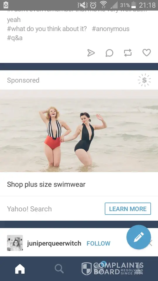 An ad for shopping for plus size swim wear on tumblr is accompanied by a photo of two women who are most certainly not plus size. There are many issues with this as this is a false representation of size and should not be anywhere in the public eye. A lack of representation of diverse body shapes and sizes leads to negative body images and means that people cannot see themselves in the media they are consuming. This stretches beyond film and media and into advertising such as the ad placed on tumblr. I would greatly appreciate the image being changed to a more realistic and representative image for different body shapes (and while youre at it a person of colour wouldn't hurt either)