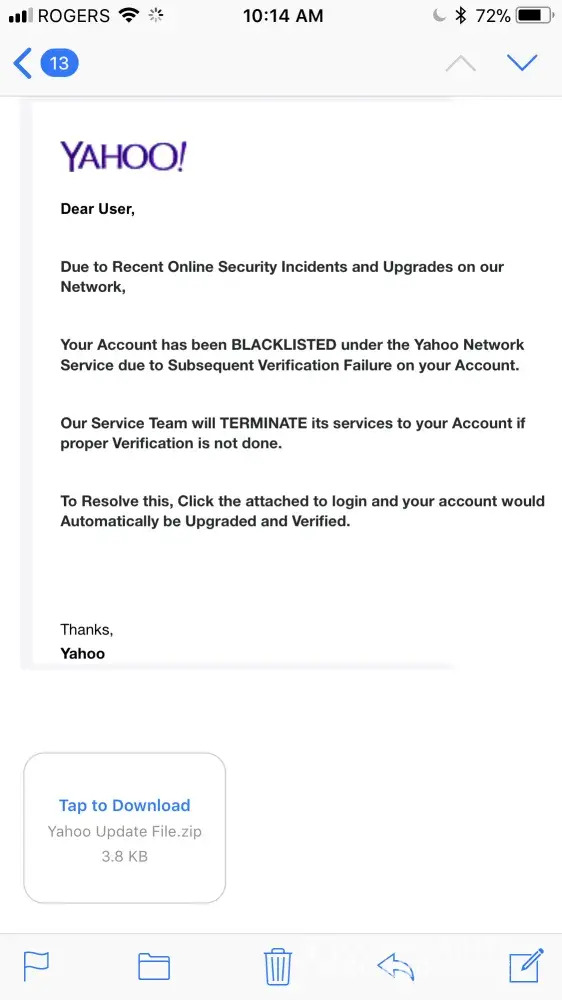 I received an unusual email from your company that my yahoo account will be terminated (Subject: Email service termination) and then I need to update by clicking the - upgraded and verified .Can you please let me know if this email letter is coming from Yahoo Company not from Spam or Hackers? My yahoo account is [protected]@yahoo.com