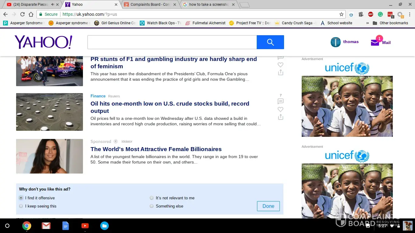 I have a Yahoo account for my e-mail, address [protected]@ymail, and I have multiple times reported numerous ads that I find offensive using the dislike option on Yahoo. These ads are sponsored content on the Yahoo homepage and feature titles such as "The Worlds Most Attractive Female Billionaires" and "19 Celebrities Whose Sisters Are Way Hotter" as well as other SEXist articles that either value women based solely on random social definitions of attractiveness or seek to shame women for behaving in "unsocially acceptable" behaviour. In spite of recent events, i.e. USA Gymnastics scandal, the President's Club, etc., Yahoo seems to think that it is perfectly fine to publish this [censor]. I am not only disgusted at the SEXism on display but also insulted that, apparently just because I'm a 26-year-old male that Yahoo would believe that I'd be interested in articles such as these. This is extremely stereotypical. Although I am interested in women, I view them as equals, not objects to be discussed and judged only on their looks. More than 1 hundred times now, I have used the Yahoo report feature to report these ads as offensive, and it says that they will remove this and make the "necessary changes" yet they return almost immediately afterwards. This is exceptionally annoying.