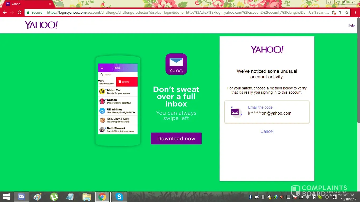 On 10-16-17 or thereabouts, our Yahoo account was hacked, and a scam message sent to all our contacts, causing no end of problems, including changing our password, considering a new address, and notifying the authorities as well as all our contacts.