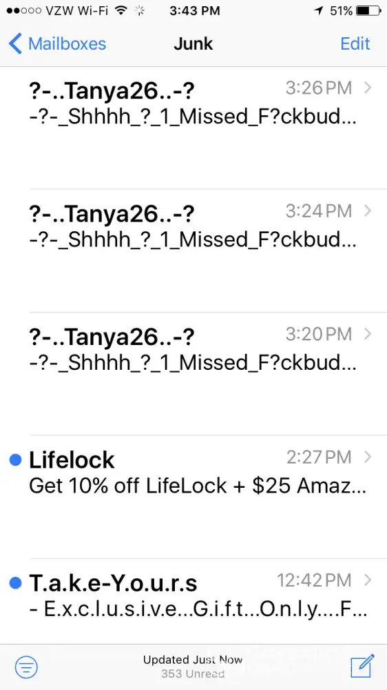 I have been getting in upwards of 5 w-mails per day that are OBVIOUS spam and highly offensive. They all have "?" or other special characters in the subject line. They also have offensive words in the subject line with a letter or two replaces. It appears that the majority of them are offering sex and nude pictures from various people.