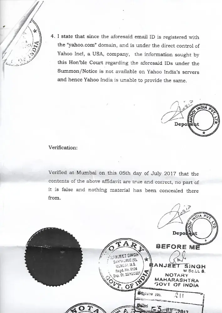We have asked to yahoo india to just authenticate the mail in the court but they simply submit a affidavit that they are not able to authenticate the mail. I am enclosing the affidavit given by yahoo for your reference.