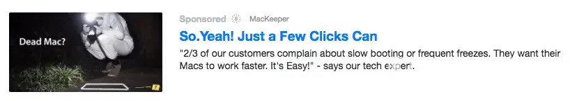August 2, 2017 @ 11:30 AM. I see yet another sponsored ad for MacKeeper on the Yahoo home page. MacKeeper is a well-known malware distribution platform. They are very aggressive with advertising and targeting those who post anything negative about their product, but as an administrator of Macintosh systems at a college in Canada, I can tell you I see a lot of students with this software on their systems and invariably they need help removing it. There is a Macworld magazine article that explains how to remove this software without going into why you would want to, as the parent company (formerly Zeobit, now Kromtech Alliance) tends to sue anyone who claims their software is no good. Their software is not malware, but it does little good for your Mac in my opinion and I believe it is often bundled with malware that is installed at the same time, taking over your Internet searches and causing pop-up ads. The software is often deliberately not very good at uninstalling itself, so you generally need help getting rid of it.