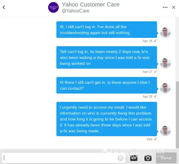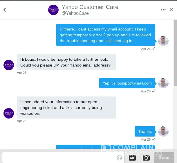 That morning I contacted Yahoo Care via twitter who told me a fix was going to be made. This was on the 26/04/2017. Later in the day I still couldn't access my account so I messaged Yahoo Care again but did not receive a reply. Since then I have been repeatedly tweeting at Yahoo, Yahoo Mail and Yahoo Care as it is the only way to contact them. I have also been repeatedly messaging Yahoo Care for help and updates with my account. Despite this I have heard nothing from then since the 26/04/2017 when I first messaged Yahoo Care on twitter.
