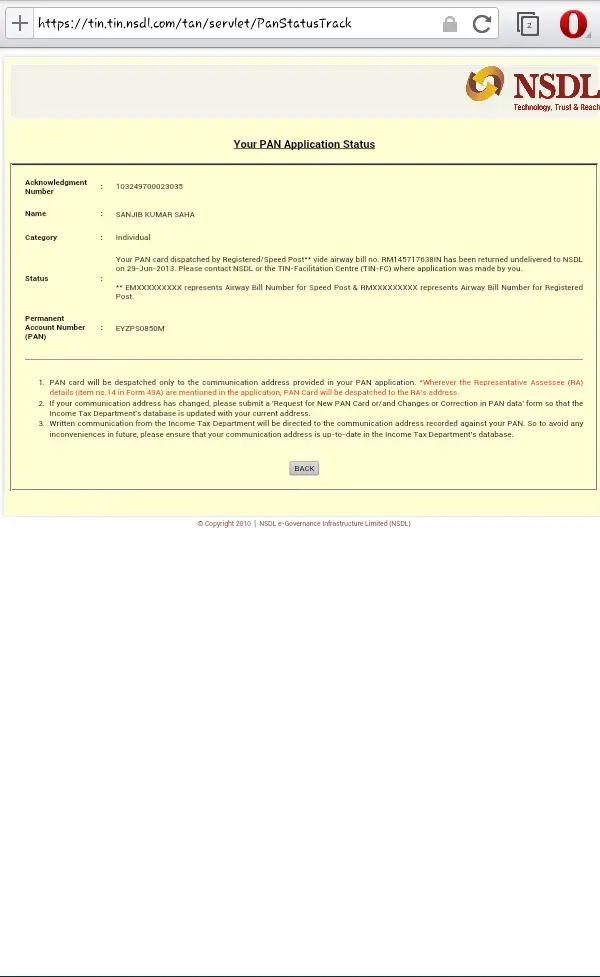 My pan card dispatched by Registered/Speed post vide airway bill no. RM145717641IN has been returned undelivered to NSDL on 01-Jul-2013.