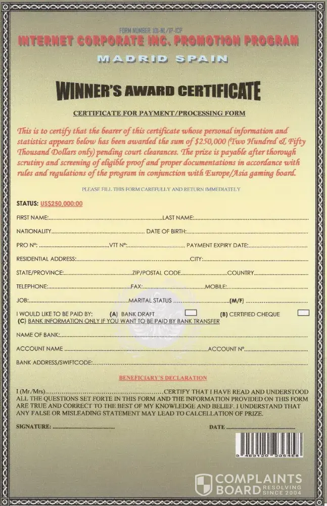 This is the e-mail i am sending to the complantsboard.com for verification details it is Believable or Un-believable (TRUE or FAKE) and send me the details e-mail to my ID of complentmail@yahoo.in