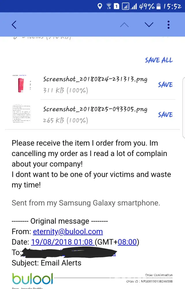 I was here at home when the delivery guy came. And we just let him knock until he get tired. I actually pity him as he doesn't know anything about the items. Their company is just a third party. But I have no choice, I dont want to be one of their victims. So yeah, as expected he stopped and I received a message from ninja van telling that the delivery failed and gave me a link to change sched. of delivery and also options of changing the del. address. my light bulb switched on again and clicked "changed address" and guess what? I put the address of this bogus which I read to one of the comments here. After so, I sent an email to this eternal@bulool.com sent screenshot of the picture of the item together with the order no. they sent me in my email and I wrote, "Please accept my order! I am cancelling it, I read a lot of complains about your company and I don't want to be one of them!"