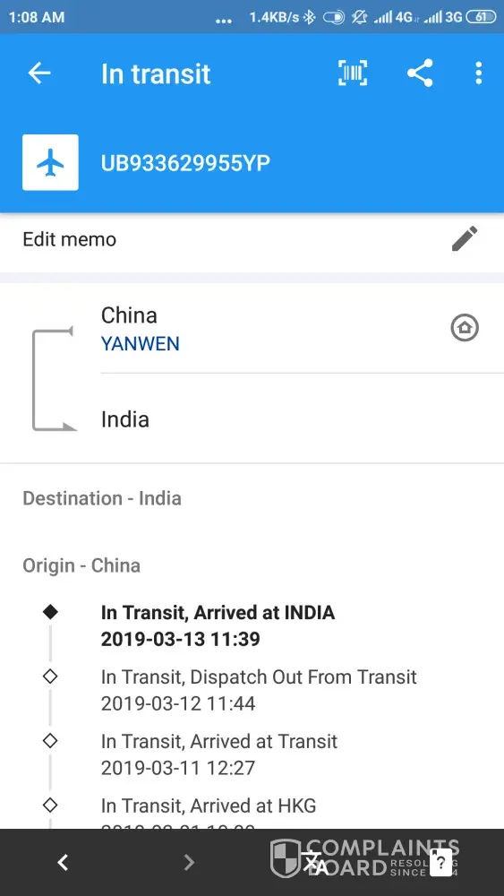 2019-04-12 15:39 China, Receive item from customer (Otb)