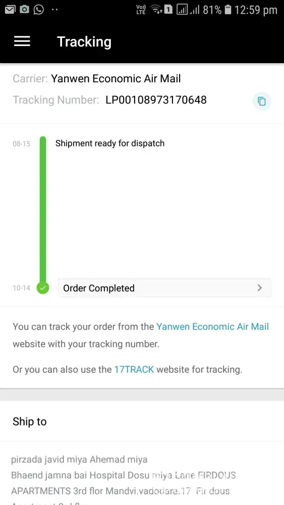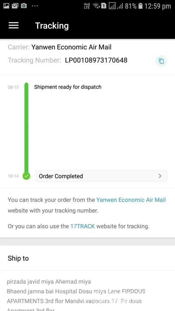 LP00106817600363 my shipment tracking number. Its been more than 2 months since I hv placed an order. I am not able to track the shipment. And when m tryin to ask the seller about my order they are trying to fool me sayin order Wil reach in 2 days. N its been more than a month since m repeatedly following up and they are not giving the exact details. It has arrived India on 9 Sept and I have still not recieved and now the status is showing as order completed. Can anyone please try to find the status