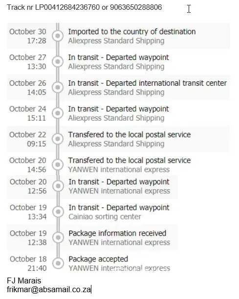 Could you please provide me with the international tracking number for this shipment? The last tracking showing from Yanwen is in Sep. I need to know where this package is and no one in South Africa has any details on this tracking number [protected]. The all say that there should be an international tracking number on this and they can only help me once I have that. Been waiting for this package for over a month now and the last tracking shows that it was dispatched to South Africa, NOTHING ELSE. Please help.