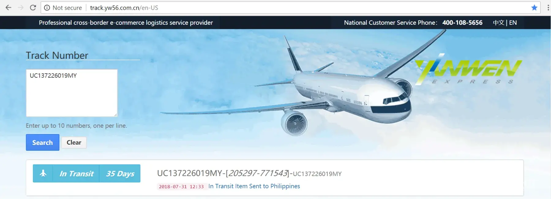 A postal parcel was sent to me via your service on 05 May 2018, 17:33:32 PM, which has the tracking number UC099709124MY.