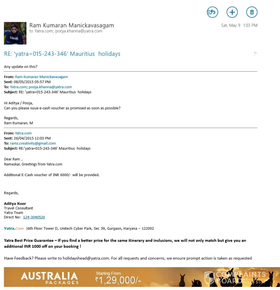 I'm Ram Kumaran from Bengaluru, I booked a trip to Mauritius via Yatra. Aditya Koer, Travel Consultant of Yatra promised that he'll issue me an E-Cash voucher for Rs.6000. Later I also dropped a mail to Pooja khanna, she didn't respond and hence I called Deepika Yadav, she assured that I'll get it and will escalate to concerned team, still no response. I ALREADY RAISED A COMPLAINT REGARDING THIS and NO ACTION WAS TAKEN. PLEASE ISSUE MY E-CASH VOUCHER OR PROVIDE IT AS REFUND.