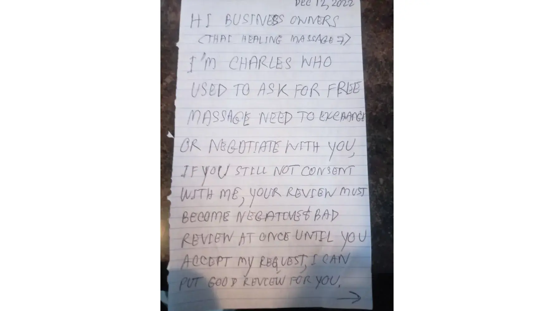 Yelp.com Health business service, thai healing massage 7/charles mirrion's fake reviews
