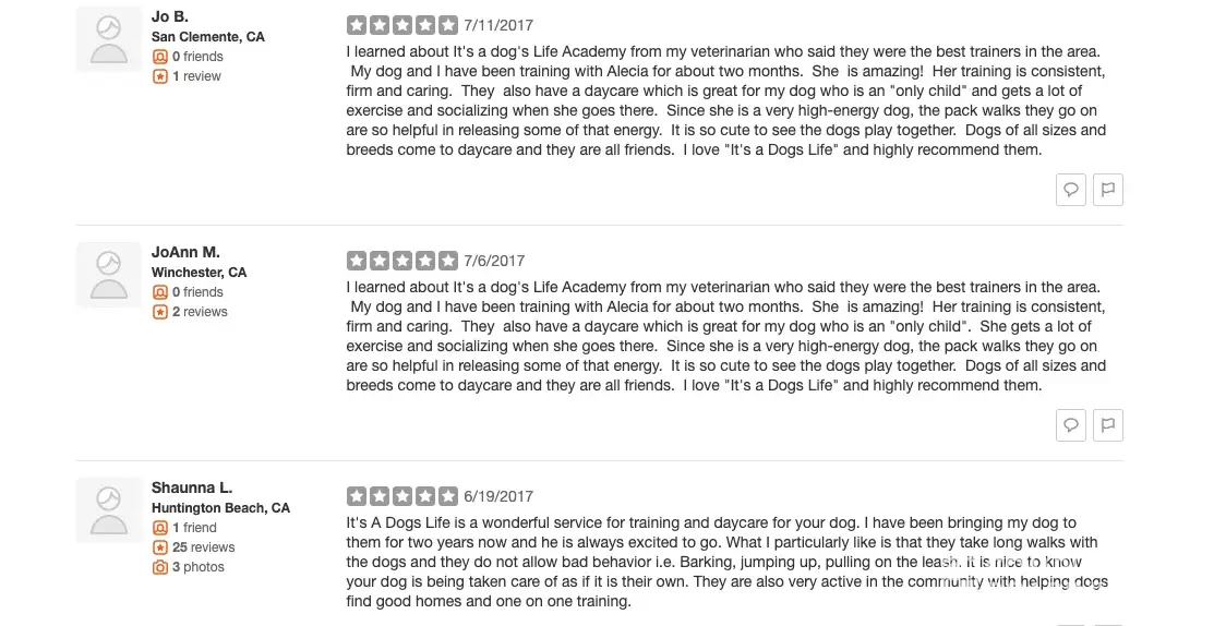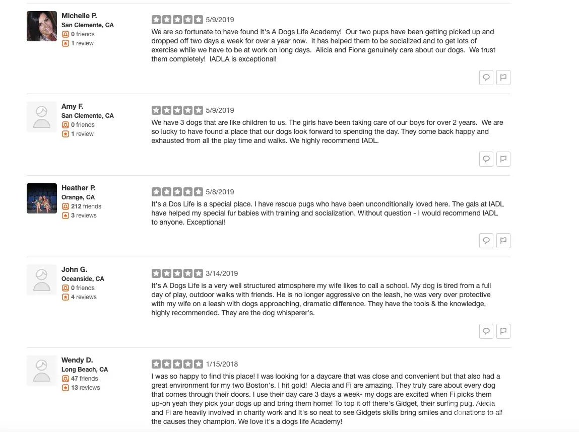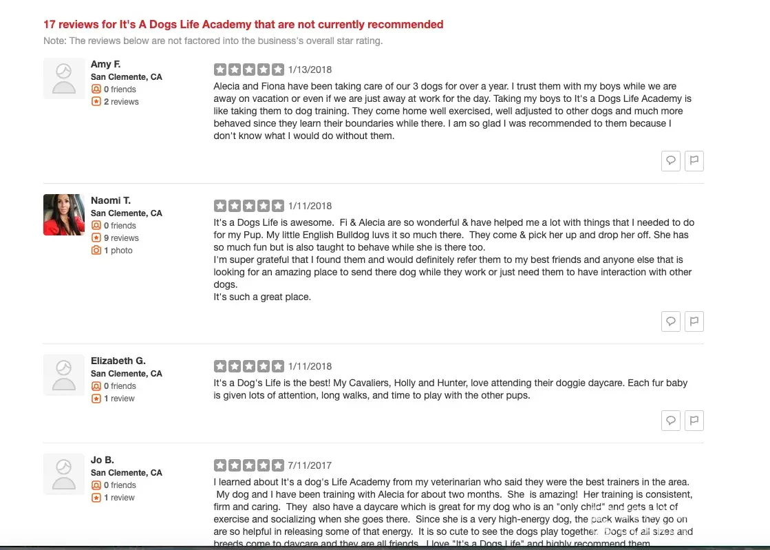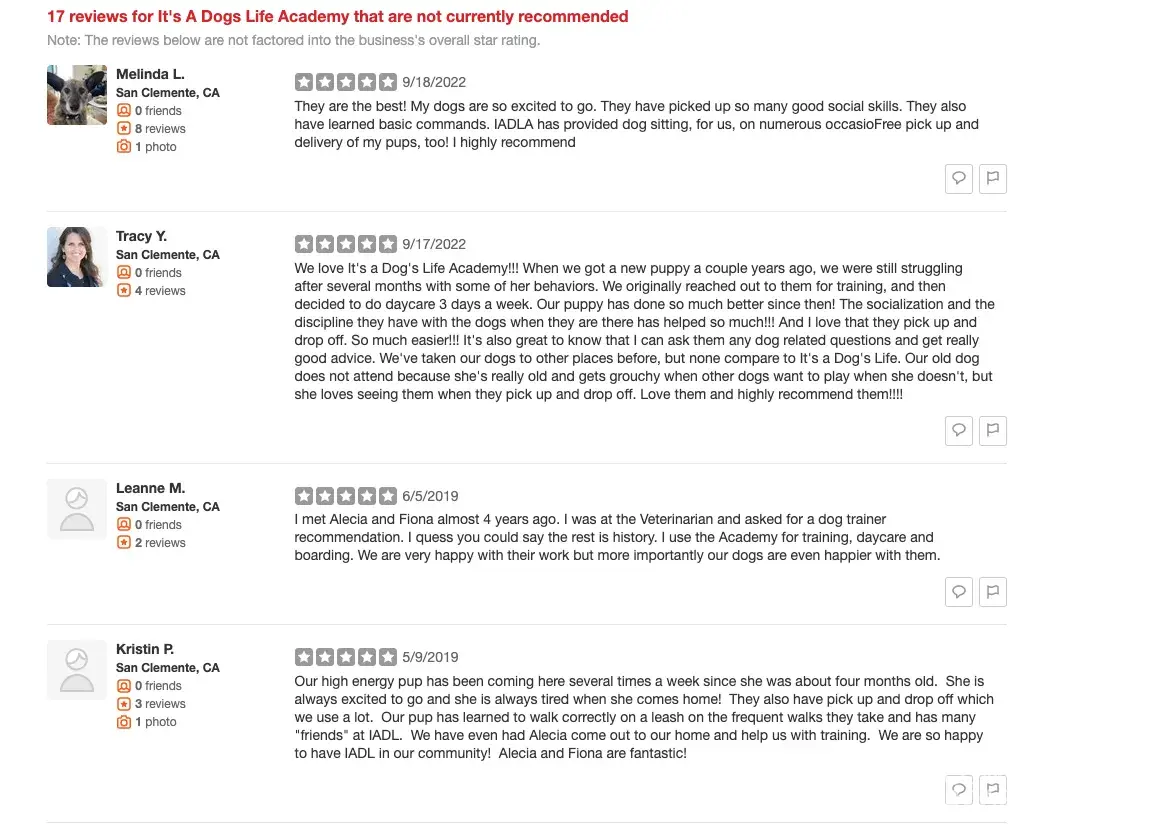 I am the Business owner of It's A Dogs life Academy. I am addressing an issue with YELP as I had a customer contact me a few days ago regarding a 5 star positive rating recommendation post on YELP which was moved to a "Non Recommended" section. After looking into my YELP account I noticed nearly 20 legitimate customers who still attend today were also moved out of the positive rating section. With determination I found a number for YELP & spoke with an employee named Denise