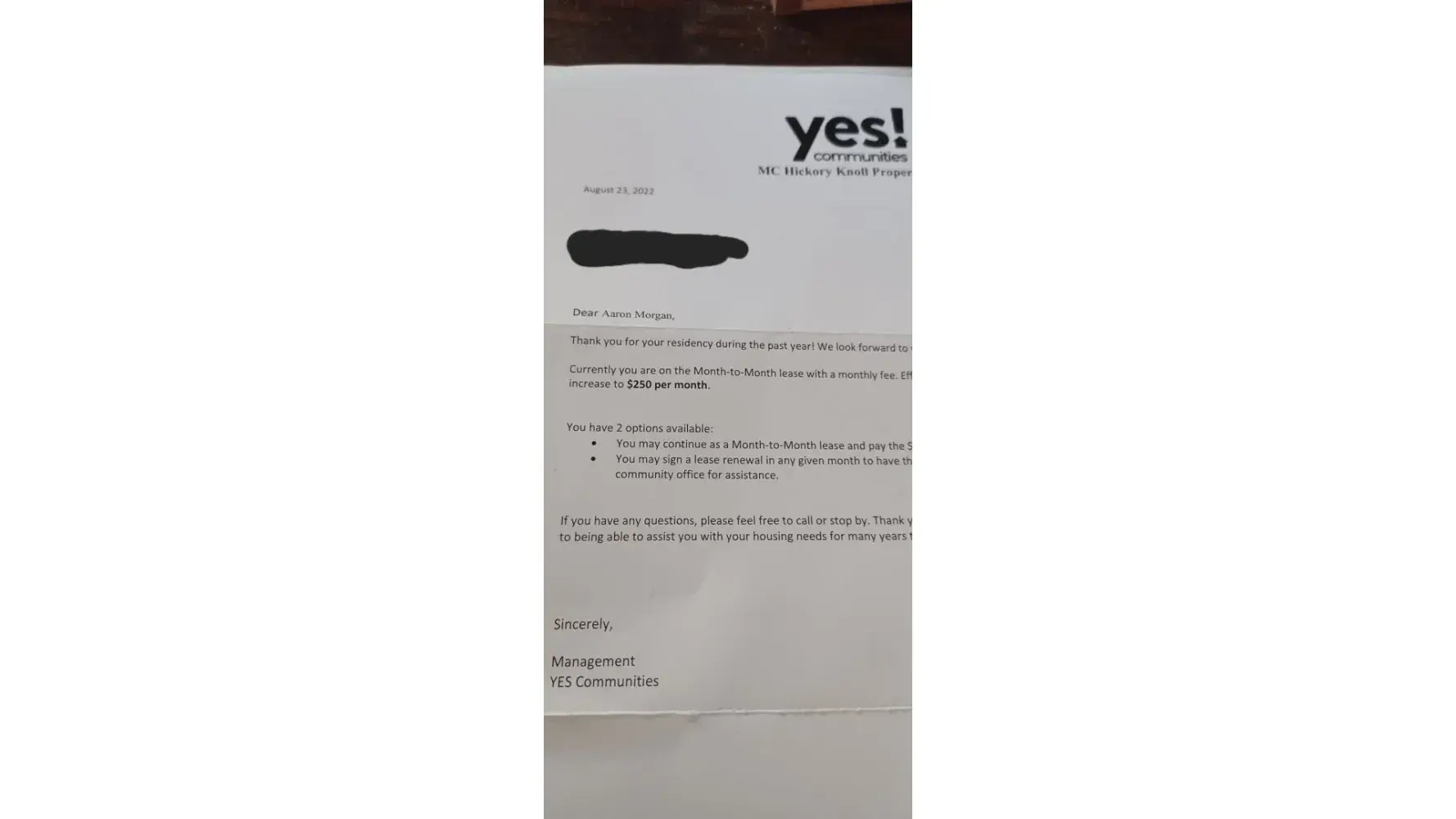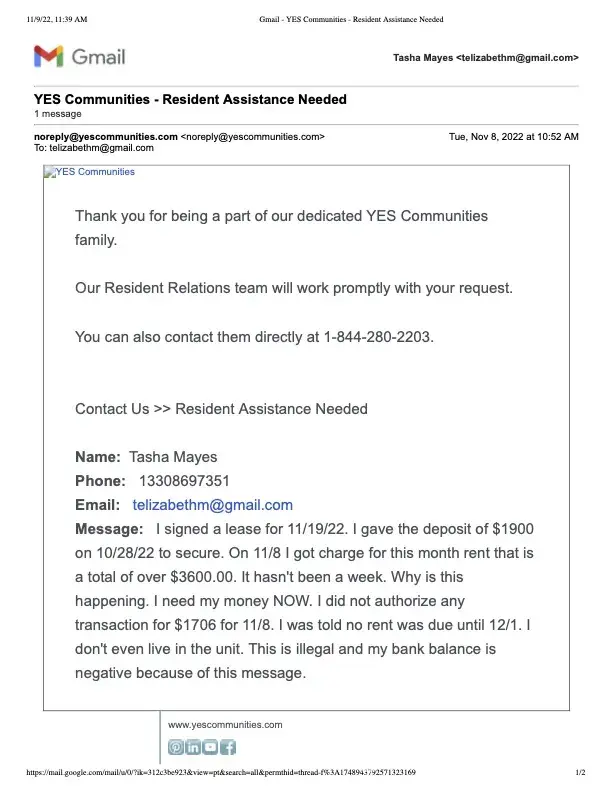 I would just like to know Yes Communities resolution and have their support against future possibility of retaliation. I don't understand why they can't speak to you and support their residents when something like this happens.