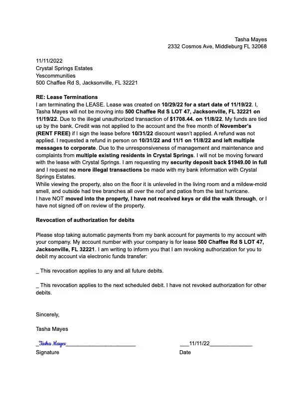 I signed a lease on 10/29/22 afternoon at 4pm the lease starts on 11/19/22. After talking with resident complaints and that currently live in community, and complaints on this forum I no longer wanted to live there. I called in on 10/31/22 (less than 48 hours) to request my security deposit back. Over the phone they said I could have it back. I drove to the office to pick it up the refused to give me my security deposit they said they scanned it and couldn't be refunded. They didn't not give any phone numbers for me to contact but the 1-800. I called I emailed multiple messages and no response. No one is responsive. The security deposit didn't clear until 11/8. ON top of that they said November rent would be rent. on 11/8 they charged me for rent. When I didn't live there or move, this took my funds away to even move for 11/19. No one has been responsive the illegally took an additional 1700 out via ACH for rent for the month of November when my lease begins 11/19. I did NOT approve or agree to this. I sent multiple emails adding for a refund. NO ONE ANSERS the phone. I refuse to continue on with this type of treatment and I haven't even moved into the home. I want my MONEY back ASAP. I have called multiple times used the contact us page. Left messages on the 48 hour hotline. Contacted corporate. NO RESPONSE.