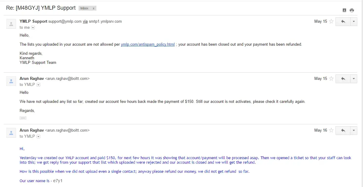 I had purchased YMLP account ($150) on 15 May 2017, for few hours it was showing that account will activate ASAP but I got a reply from customer support saying the list I had uploaded were rejected and my account is closed and will get the refund.