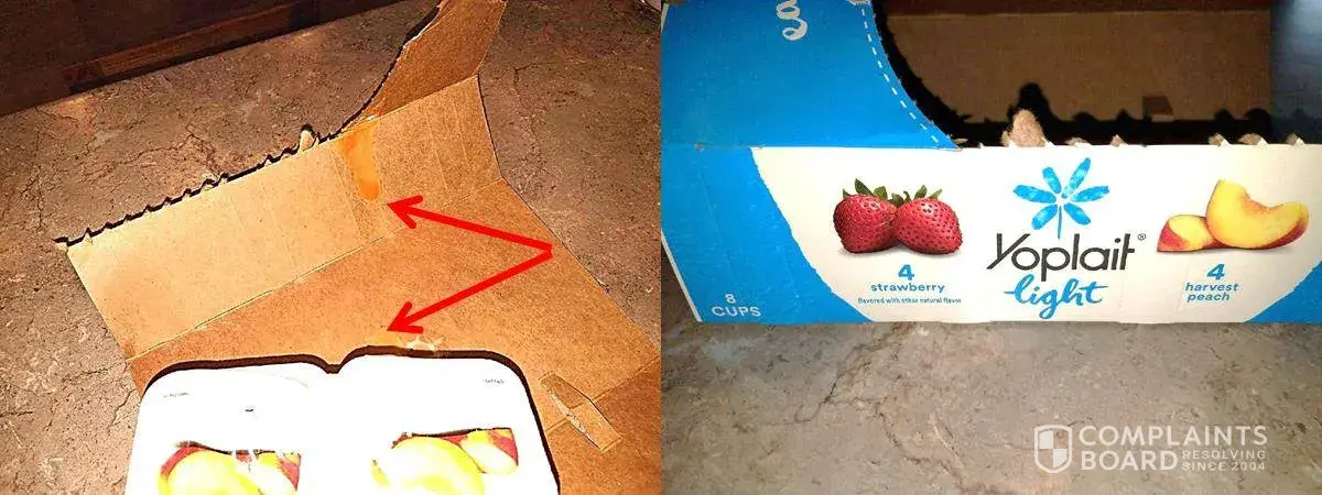 Opened up a new package of yogurt this morning. Two of the peach yogurts either had glue or dried yogurt on top of them and when I tried to remove the cardboard covering the covers on the yogurt containers opened up. Now I don't know if they were really even sealed up so I had to dispose of them. You need to make sure that your process makes sure that there is nothing that is going to stick to the cardboard and find out why it got there in the first place. I included a picture so you can see where the non-conformance was and take steps with your employees to prevent this from happening in the future.