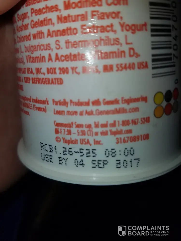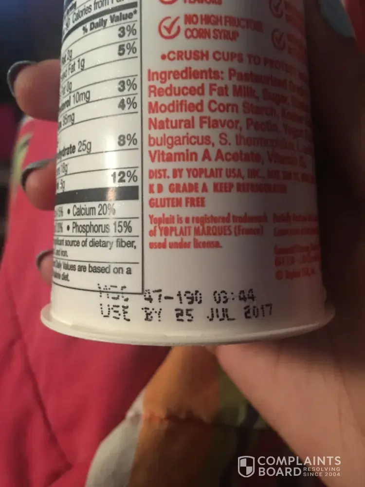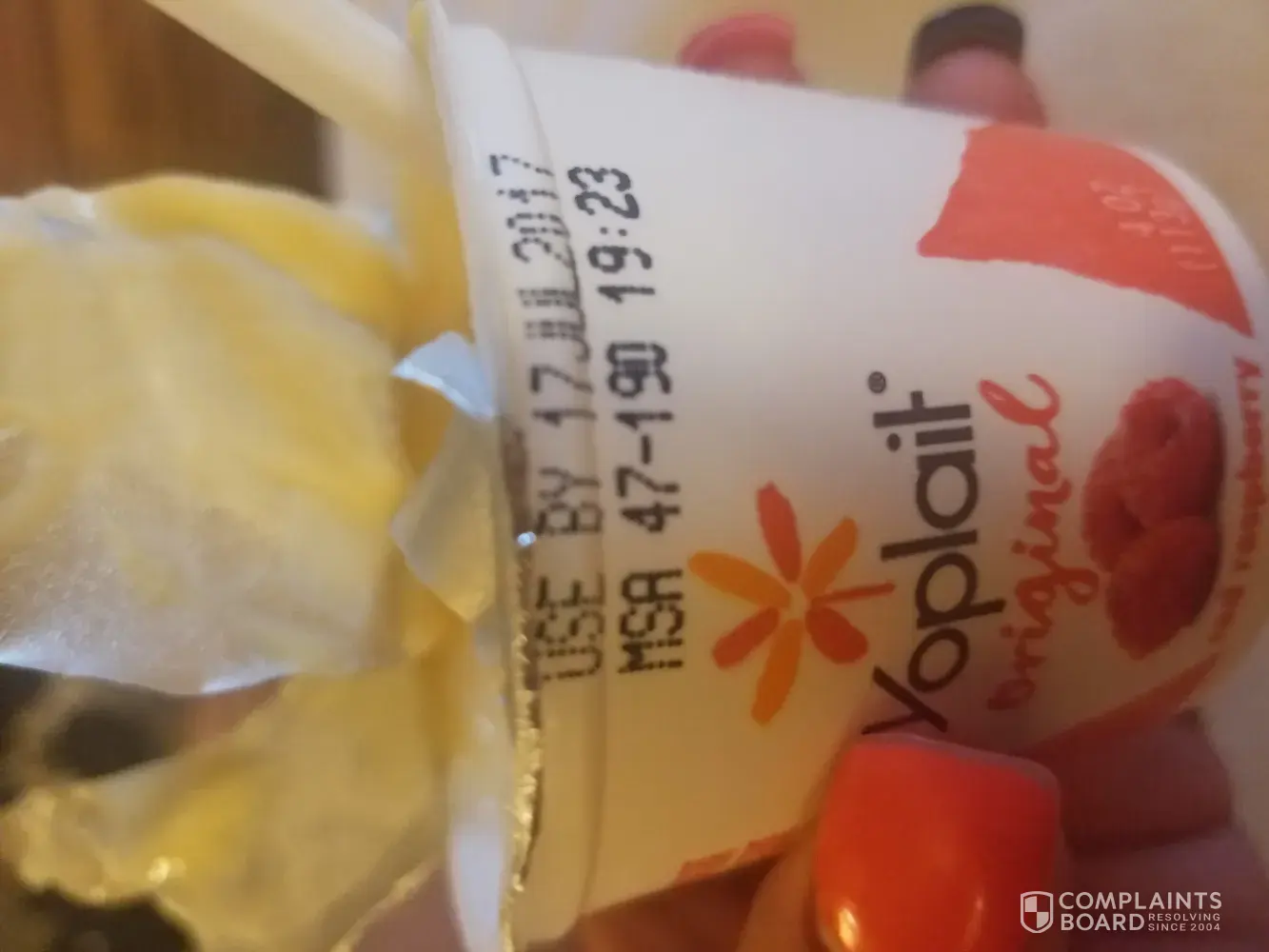 Okay so I went to go grocery shopping the other day and bought about 2 or 3 yoplait yogurts. As my normal self I always check the expiration dates on everything. Well this came as a shock when the expiration date was "july 25 2017" of this year. And when I bought it the date was "august 3 2017" explain please. Because my child loves your company and I don't want her to get sick from it😬