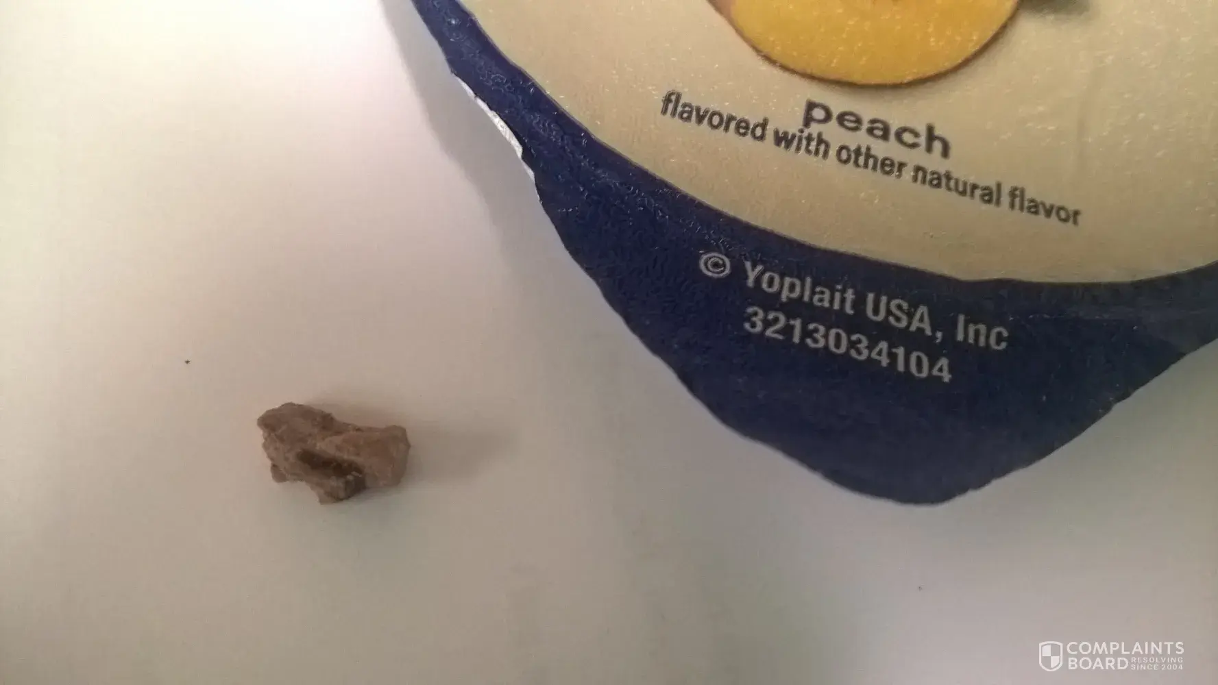 10-9-17 - eating yoplait yogurt and something hard hit my teeth. I split it out. The piece is hard; brownish tan color e.i plastic, glass or rock (size 1/4" long, 1/8" wide)(see picture) numbers on lid #[protected], side of cup #47-190 use by 31Oct2017 MSD1 13:27.