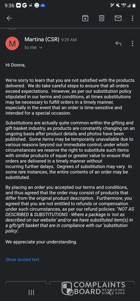 I ordered a bourbon and cigar basket that totalled almost $200. It was delivered timely but they had switched the contents without consulation. Upon removing the basket from the packaging, items were also damaged. I did not have time for a return so I rewrapped the items that were still usable. The basket was gifted to the best of my ability while waiting for a possible partial refund. It has been 5 weeks since my initial phone calls and emails including pictures as their policy states and I have yet to get a response from them. I have also placed follow up calls and an email. I was told that they will get back to me and still no response. I AM VERY DISAPPOINTED. WILL NEVER PLACE AN ORDER FROM THEM AGAIN