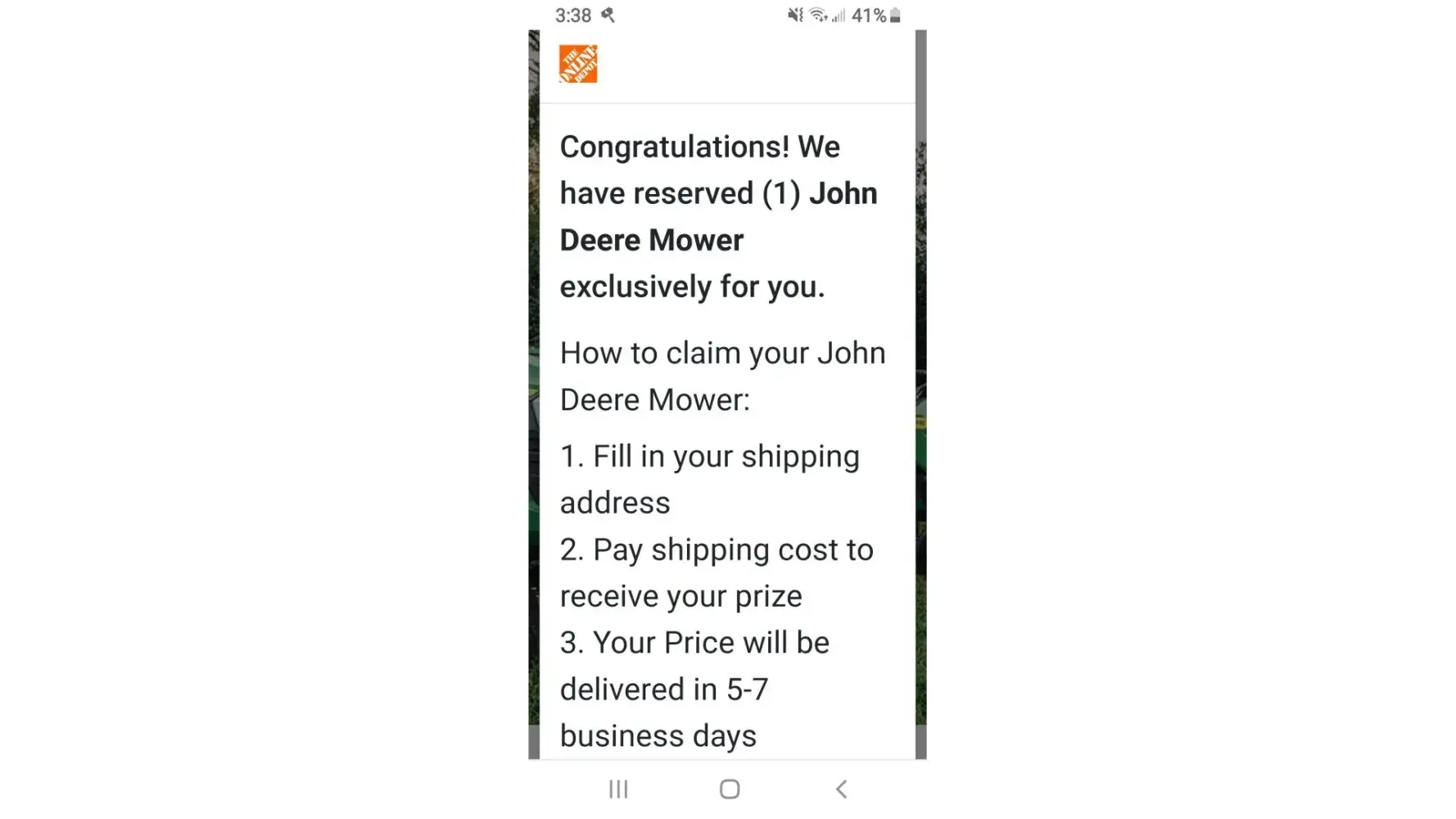Got a email saying participate in a survey and I would enter a chance to win a John Deere lawnmower. Thankfully used my unlinked Cash App card, which I have frozen and will be deactivating, because I searched after and saw how many people had been scammed by the "Customer Service" phone number for various things. I called and waited on the phone for 15 minutes before it asked me twice to press 1 if I wanted to leave a voice mail. Then it hung up, I did not. About 10 minutes later I decided to check my card again and it declined a payment for $89.95 which I didn't agree to. Thankfully I'm only out $1.95, but it's still hurtful for the people who run personal businesses offering legit rewards for people, like I used to run. Get a life!