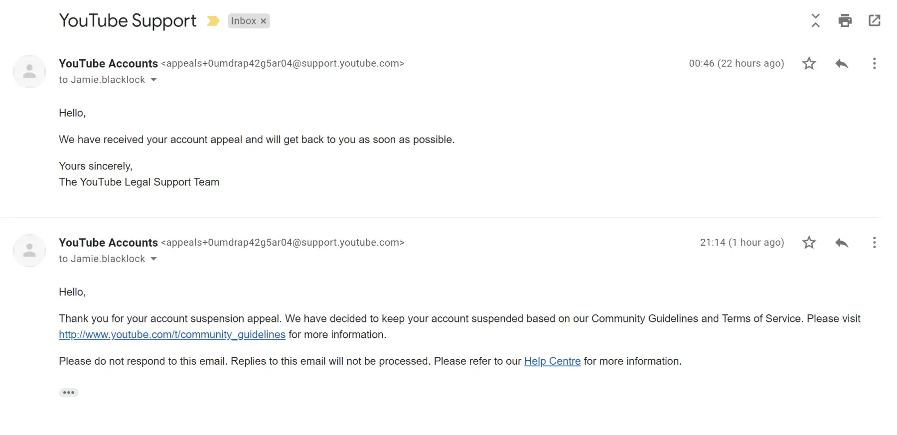 I urge YouTube to follow up on Todd's complaint immediately.