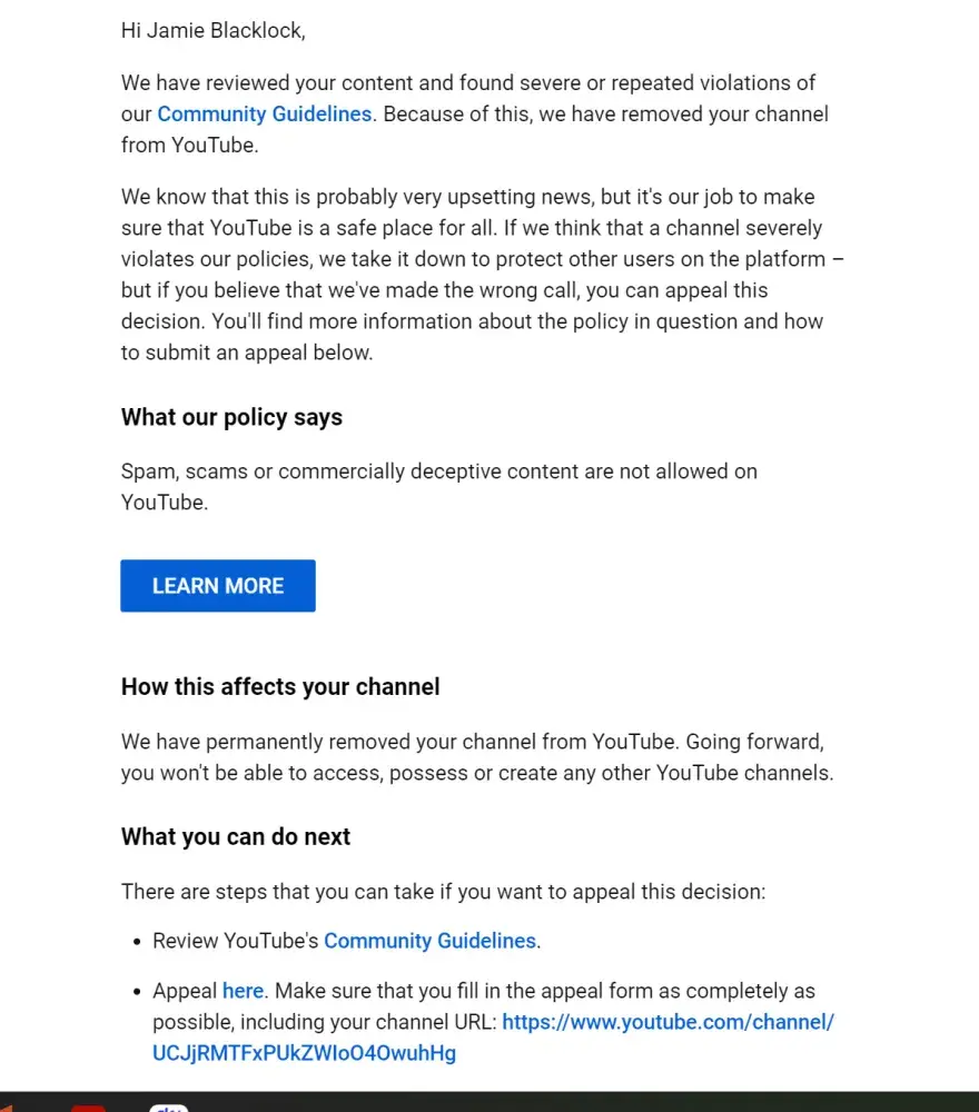 YouTube channel deletion without reason
