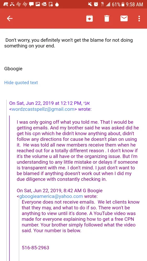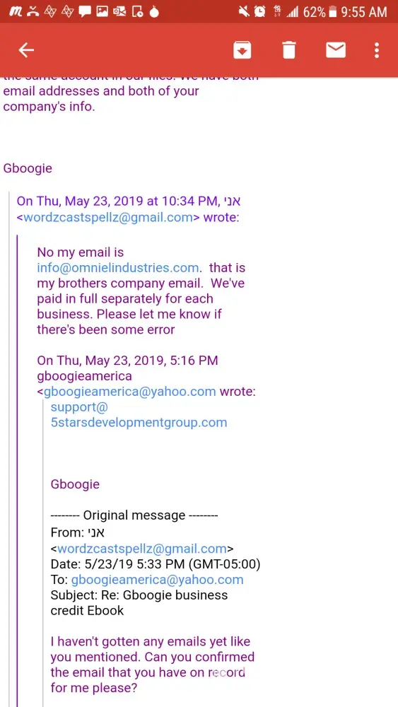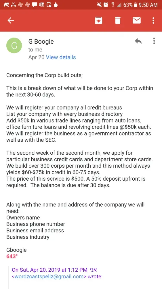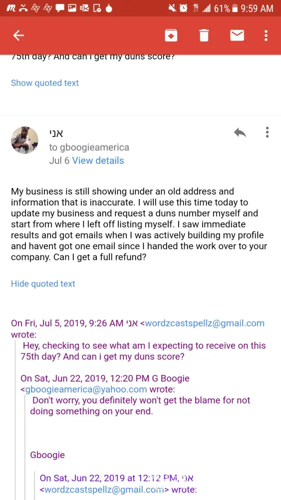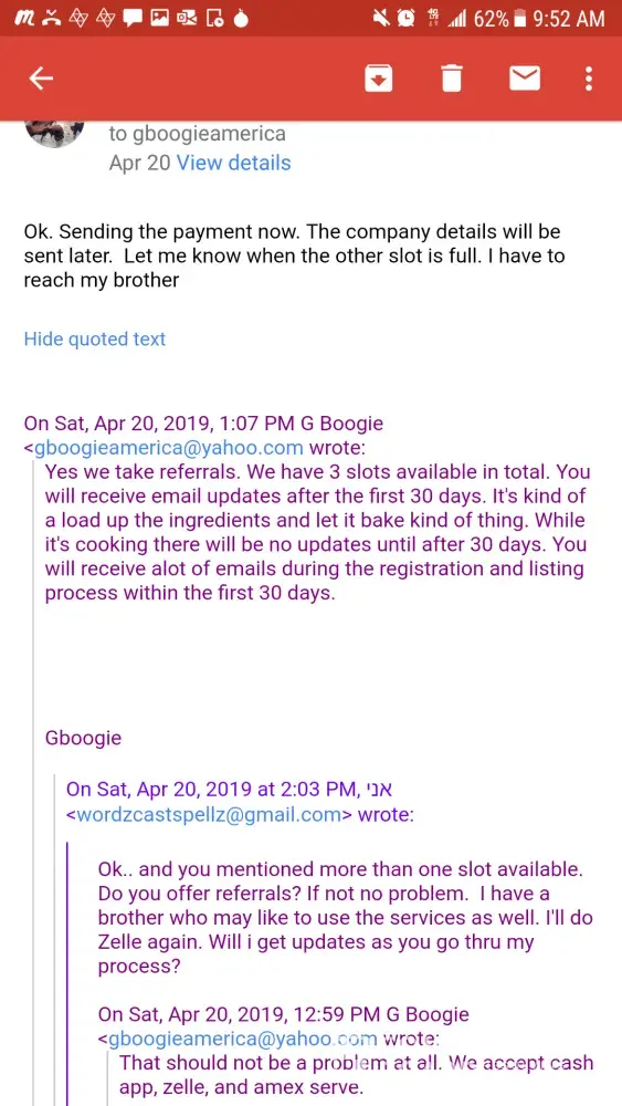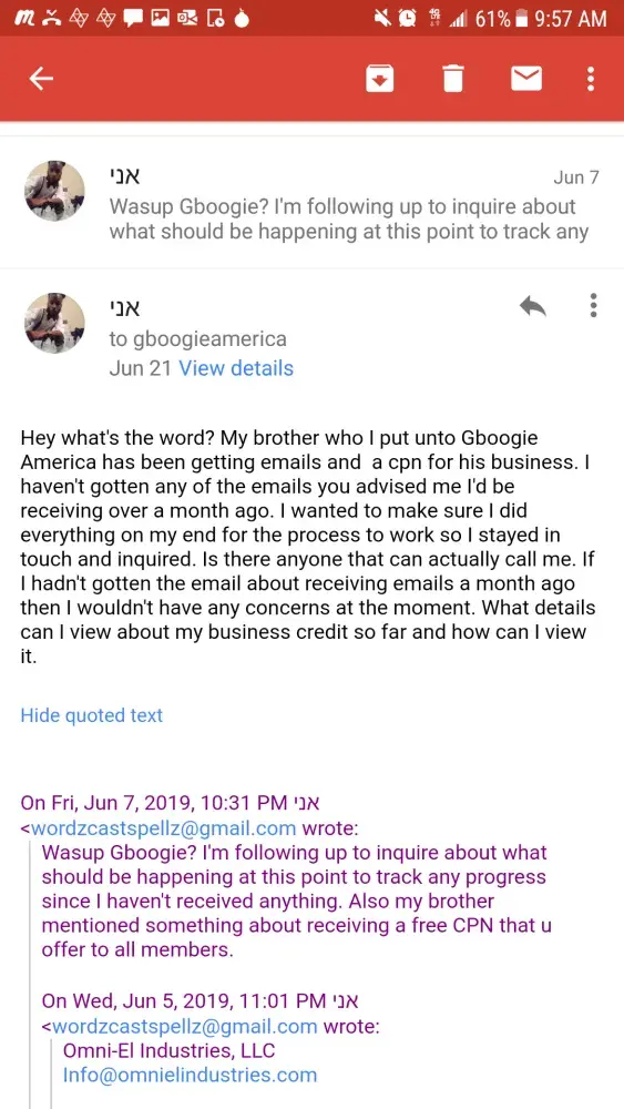 This may be a bogus address they utilize just to hide their location. I purchased a service of business credit building from this company on April 20, 2019. They guaranteed 60-75days 50k-60k in business credit. I had the business started on my own and the small steps I did towards what was needed to gain business credit always showed an immediate result, ie an email address or piece of mail. Since I turned over the job to this company I haven't received one email, or any sign that they have done any work. Could not even find myself listed on Google or other platforms. The second payment of 250 was due the following month May 20, 2019 for a total of $500. After I made the payment they emailed me saying I will start to see emails flood my inbox. After about a week of no emails I was concerned. I inquired with them about this and what was the progress. When the guy confused my brother's company with mine that was the first red flag. There's no way they could have been linked since my brother and I have two separate emails, paid from our own accounts and use two different businesses. Needless to say my brother was screwed over as well. And he purchased services for two of his businesses. I continued to monitor my email and inquire with them if there was anything needed of me. The answer always vague. It would be along the lines of no we got it covered these things take time. When I pressed them about not receiving emails they began to change their story. 2nd red flag. 3rd red flag he gave me a cpn number that I didn't ask for. It is coming on 90 days. I've requested a full refund and haven't gotten a reply. This company does not use a payment service that allows you to dispute them. They have done their homework on which one to choose and that is Zelle. These are not affiliates of Gboogie these are his actual partners and he himself that are ripping people off. I was cautious to if they were just posting old videos of his voice since there would be no dates provided. I informed them of this. And the following day Gboogie posted a video making mention of it. That's when I confirmed it's actually him. I just didn't know he was a crook at the time. He had videos of him living off the land and investing in agriculture. He appeared honorable and not greedy. I was wrong. I too reviewed the the complaints a few years back on this company when I became interested. And I too felt that agents or false claims were being brought against them. Now I'm on the other side of the looking glass and I regret working with them. It bothers me more since I felt I did my homework and crossed all my t's and dotted all my I's before jumping in. And I feel bad for not believing in myself to continue to do it on my end before he resurfaced with the recent videos. He disappears for months to years at a time and now I can see why. If I ever find this cat, he and his partners are gonna wish they had never screwed one person over. Don't pay this guy your money. And if Gboogie or any of his partners come on here with a bs rebuttal I'll just post the full email conversation. Attached are some of the conversations. It was too much to do from my phone. Dates read from bottom to top. The service provided is fully disclosed by him in the email along with the time frame.