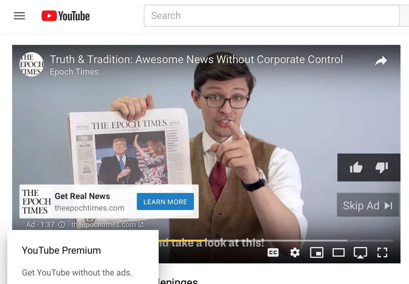 I am very disturbed seeing that YouTube is allowing this pro Russia / pro China propaganda newspaper "The Epoch Times" to purchase advertising space. Why is YouTube not preventing this and investigating who is buying ad space? Particularly in this time where an adversarial country(ies) is trying to invade our election processes. It's disgusting. I am very likely going to report this to the Federal Bureau of Investigations and the Federal Communications Commission. What will YouTube not do to make a dollar. Disgusting. Please reply to this complaint otherwise I will assume it is ending up in the garbage with your other legitimate complaints.