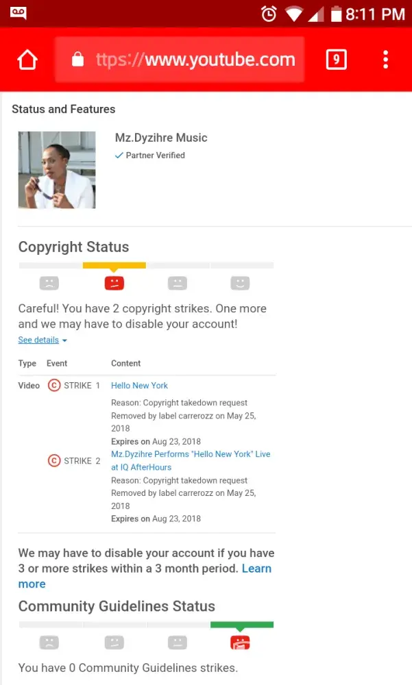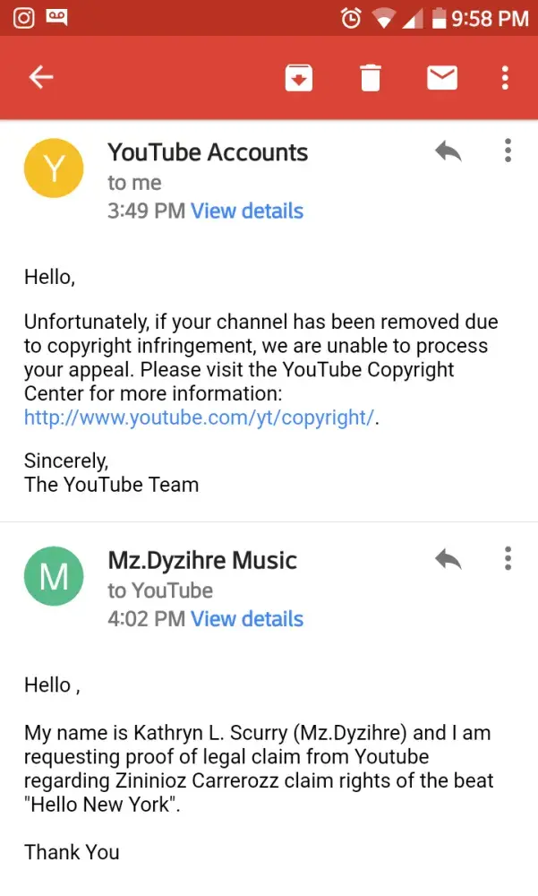 I am very disappointed in Youtube. I just had my account of 10 Yearsvdisabled because Zininioz Carrerozz a Youtube user made a false copyright claim to a song /instrumental that was created by me called "Hello New York" on a program called Soundation. I can no longer access my Youtube acount. I've submitted documentation that the music is rightfully mine and I am the owner. I also have radio station proof that he is not the owner.