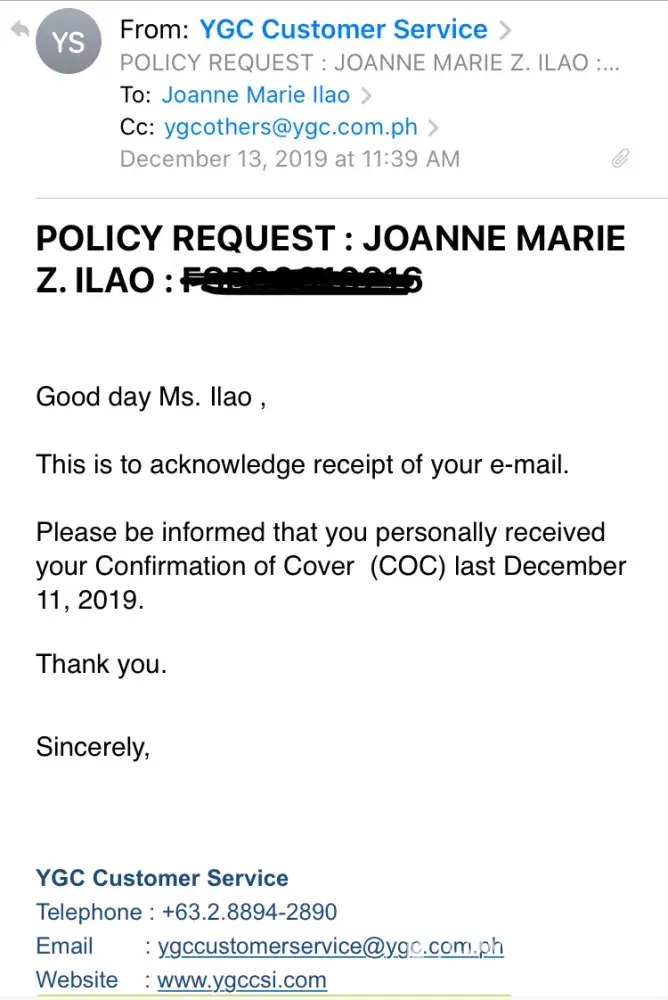 After the experiences I've had so far with Malayan Insurance company and their customer service, beginning from which I did not receive my policy contract, hard to call hotline number, disclaimers and important informations not entirely and thoroughly relayed, rude customer service representatives and slow response and resolutions for my concerns, I no longer think I am secured in this company. I already sent an email to ygccustomerservice@ygc.com.ph to request for the cancellation of the policies last December 9, 2019, but unfortunately I receive no response regarding the cancellation until now. I would really appreciate it if they will answer and process the cancellation as soon as possible before the said amounts are debited again from my credit card.