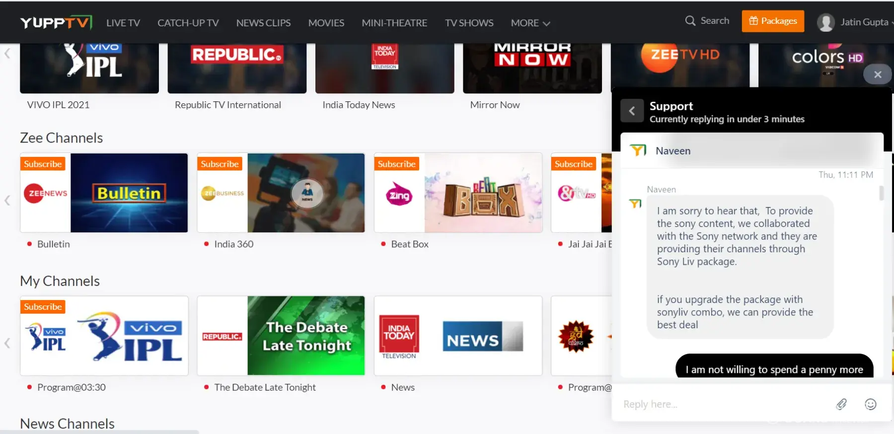 From 1st July, without any notice or discussion, YuppTV have discontinued that channel on my subscription. When I called up customer service, they told me to pay extra for the Sony channels but were not willing to refund my full amount.