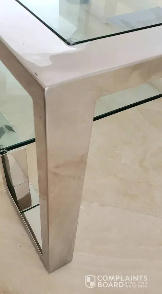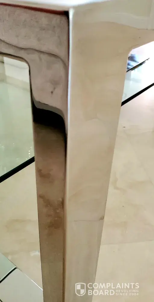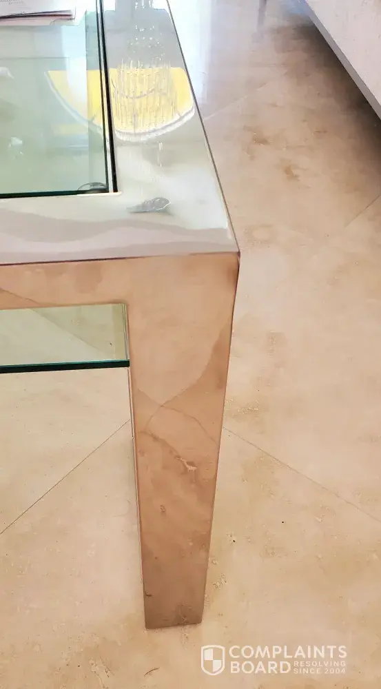 Duplicity Coffee Table finish is tarnished bronze, not appearing silver, every meeting side seem is indented appearing damaged. Entire frame is defective product. Three (3) Photos sent to Escalation. Price Adjustment Requested.