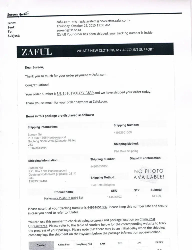 I bought a swimsuit from Zaful and never received it. I spent days just trying to get in touch with somebody from customer service. When I finally reached someone they said that they have no idea why my item was not delivered and said that it was not their fault. They said that they can send me another swimsuit but I have to pay for it. I was told that there will be no refunds. What a joke! I will never order anything else from Zaful. Their shipping service is horrible, not to mention that products they sell are poorly made and quality is absolutely rubbish. Sizes are very small and sometimes items are also damaged. Don't waste your time and money. Zaful is just another disgusting Chinese company, avoid it!