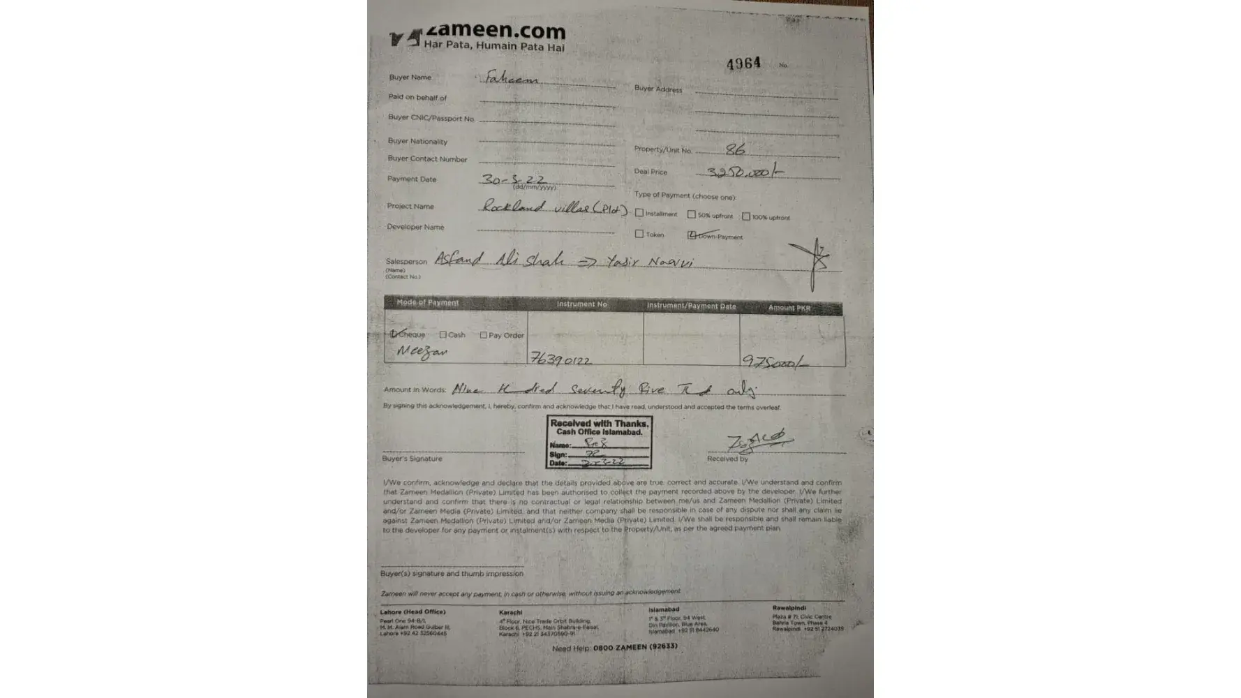 However, I have been in pain and struggling with Rockland Villa Project. I paid advance amount of rupees 975,000/- on 30th March 2022 through Meezan Bank Cheque number [protected] and Zameen receipt no. 4964 but since then zameen team did not presented/signed the contract and hold my payment since 8 months. I was and even till now following the concerned sale person regularly for a refund which was initiated back in August 2022 upon my confidence being shaken on this project where no contract was signed by Zameen.com. Since then I use to reach out follow up on any other day to know the status of my payment but he always says it is in process and will be released in some time.