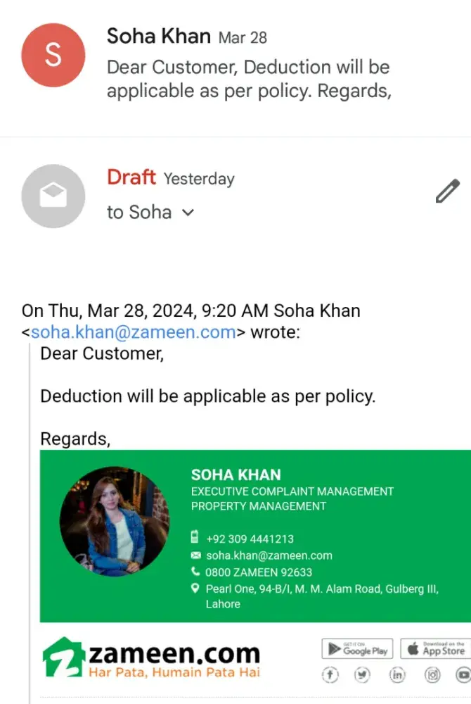 Zameen is breathing their contract by providing such terrible service. Also thr contract that me and my lawyers asked to look at our building had a page missing. Which had the force majure. My building is meant to be ready in Dec this ready. Yet they took me to the developer who had this missing page. Force majure clauses are unforcable and the builder has 2.5 years is completion. I don't care if it will be ready in Dec. As if it's not my rent will start in 2.5 years of signing contract. 35 lacs extra are they mad. Your staff are still advising people that escalation costs is for people who bought I'm year 2020 or before. That is not true is it. I have a recording of your staff who sent me this less then 3 days ago.
