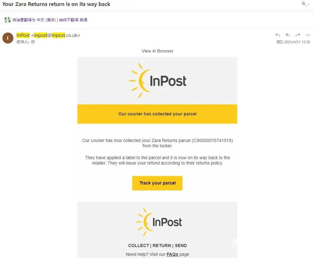 The issue that I have experienced was: I have made a return for several items from Zara on 20 April. However, I haven't received the refund for one item with the reference number 1255/816 (FAUX LEATHER TRENCH COAT 89.99 GBP). I can confirm that I returned it through the InPost drop off. I also have the return receipt from the InPost. I have two return receipts since I made the return (RETURN NUMBER: [protected]) in 2 boxes, which are Parcel Number: CS0000015741516 and CS0000015741519.