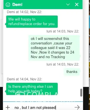I have lost count of the amount of chats via text with apologies saying it will be sorted and as yet I have no goods and I’m down so much money I don’t know what else to do.
