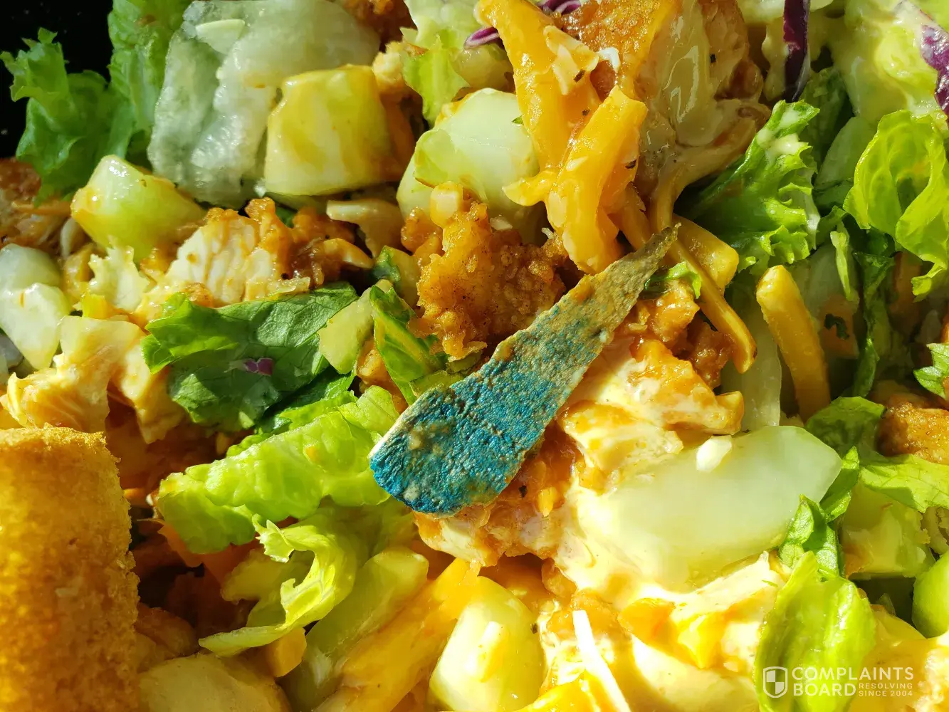 I went to Zaxby's earlier this week and ordered a House Salad Fried, no tomatoes, dipped in wimpy sauce with Honey Mustard Dressing. I went to the drive thru and went back to work. While sitting in my car (this normally where i eat lunch) i putting the dressing in my salad and mixing it up. I came across something hard. I thought the lettuce might have been hard until picked it up and noticed it was a piece of wood. I turned it over and it was painted blue on the back side. I took a few pictures and took it back to the store. I told the Manager what i found and her response was "we don't have wood here." She didn't bother to look in the sald, she just threw it away. She gave me a refund and apologized, but that was about it. She didn't seem to really care that there was a small piece of wood in my salad. I took my money and went back to work. I report this to corporate, but I never received a call or anything back. So here I am.