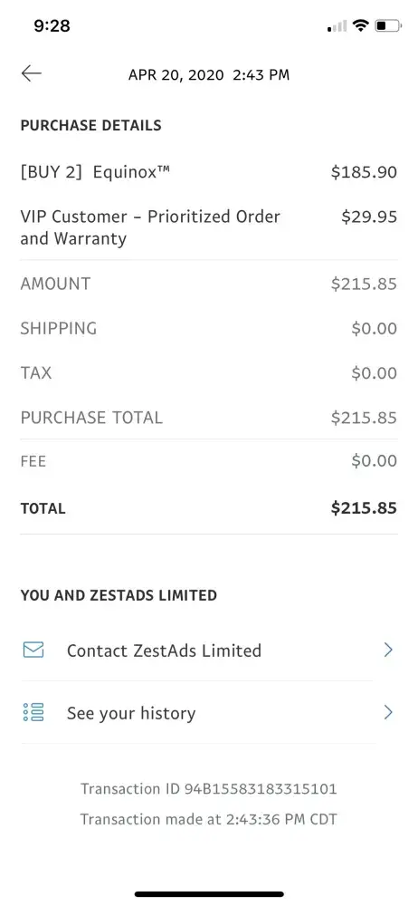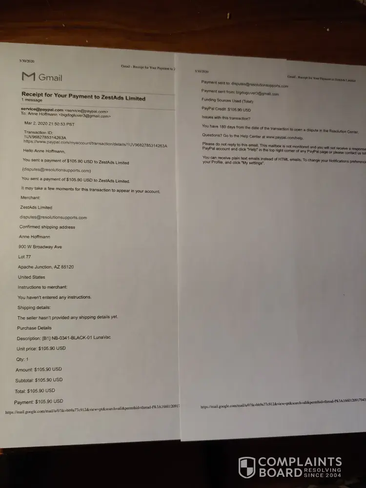 Then I type Zest Ads Limited in a google search and all this comes up lots of people getting F'd over and PayPal lets this happen even after all the complaints WTF. pay pal was not this way year ago. But there is no way to check on some of the companies ripping us off. Its not just buyer beware cause there are some big advertising campaigns through Facebook, or YouTube and the videos on YouTube present a legitimate company in many cases. So where do we go now. I want my money back. didn't have a chance to send the misrepresented item back.
