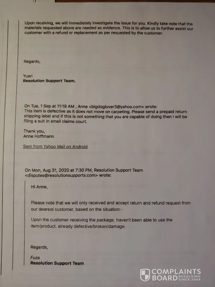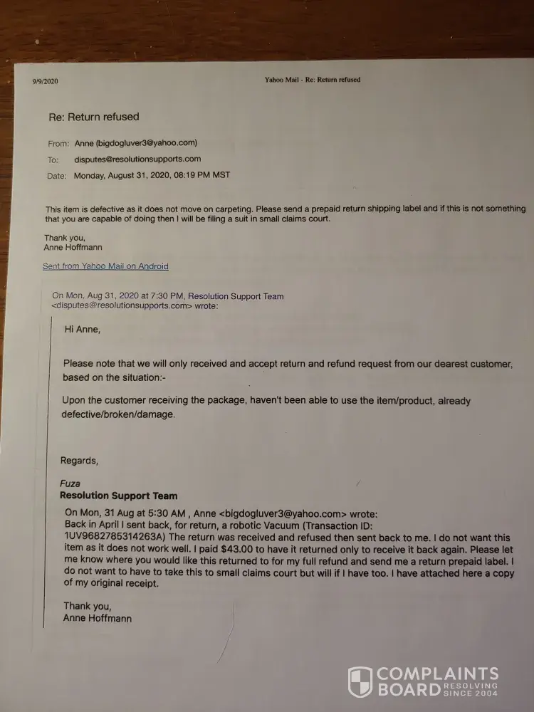 I also purchased this piece of junk Lunavac! I tried sending it back and it cost me $43.00 only to have it refused and returned to me 4 months later! I emailed disputes and they emailed back and forth with me and asked for pictures and a short video of it not working. I sent the pictures and the video of it not moving on the carpeting and they sent a video back showing how to make it work and said it will only work on smooth surfaces. I told them that was false advertising because the ad had said bare floors and carpeting. I am requesting a refund for the purchase price of $105.90 but would also like to get the $43.00 that I spent to ship it back only for them to refuse it. I originally purchased this through PayPal on March 2, 2020. I have attached the receipt and the video of it not working. The PayPal transaction ID is 1UV9682785314263A Anne Hoffmann [protected]@gmail.com