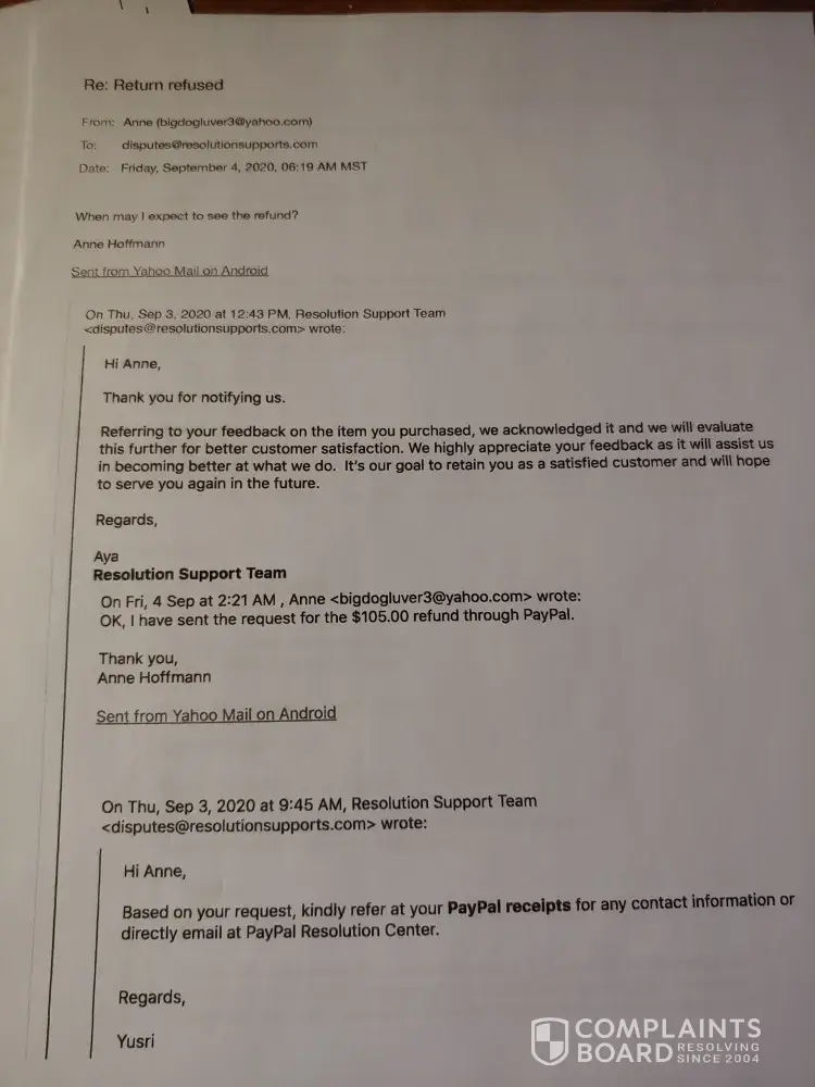 I purchase 2 pair insoles PayPal when check receipt 12 pair I e mail to cancel could not afford or want say processed I lodge dispute with PayPal they sent me their address to send back I did case was closed they not recieve try twice deliver Hong Kong then email seller say should sent address China I had it returned sent to China recieved 9th July signed for it was registered tracked I expect refund email seller say not return time limit been in contact several times they knew details now no refund time limit 45days also due to virus mail late can you help me value $552 AU know matter what I say no refund had 1st address been right to return would have had it they do have business Hong Kong