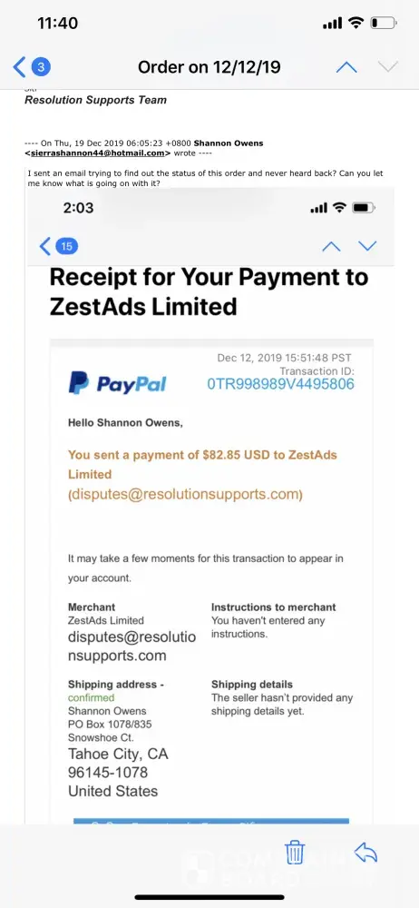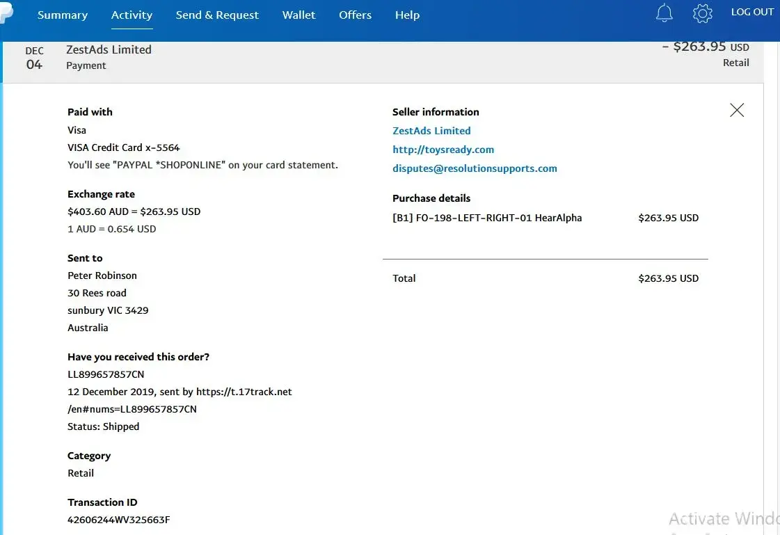 I made a payment of $135.85 USD to ZestAds Limited for a Drone, Transaction ID: 7MF30948L57932027. I have received nothing.