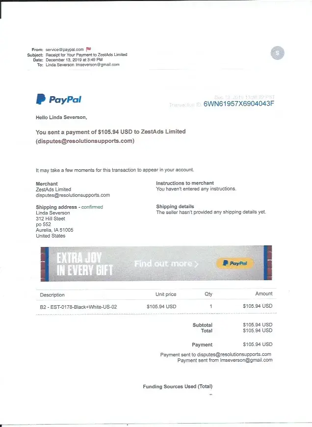 Asunto: Recibo de su pago realizado a ZestAds Limited