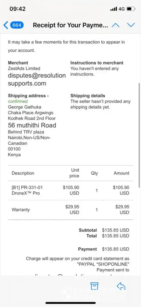 On 29Dec 2019 I purchased a Drone x pro for USD $ 105.90 inclusive of a warranty fee of USD$25.95 bringing the total to USD $ 135.85 through Paypal to a company only identified itself as Zestads limited. After sending the money through debit card ending with ... ... ... 8880 I received an email confirming my order number as 5461855E9D. (ATTACHED YOU WILL FIND THE EMAIL COMMUNICATIONS OF THE TRANSACTIONS FROM PAYPAL).