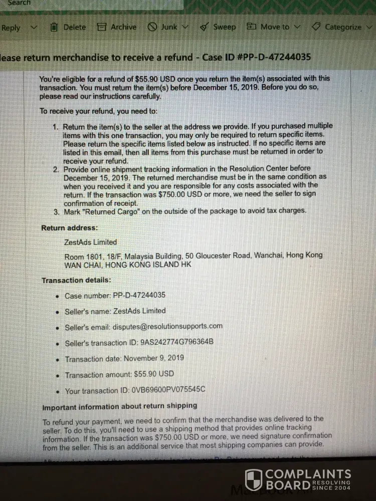 The ad was from instagram. I had seen this ad many times on Facebook as well. It was for the "As seen on Shark Tank" Perfectback. I had seen the product from Shark Tank and thought that is what I was ordering. The total came to $55.90. The product was advertised for $49.99 plus shipping. I decided to order because it was a Shark Tank endorsed product and offered a 60 day money back guarantee. After a month (ordered on 11/9/19 and received 12/4/19), what I received was a package from Hong Kong with a fake, cheap, imitation back brace with no paperwork. It was a junky nylon thing without even a plastic bag over it. The package didn't even have a return address. I promptly contacted PayPal because that was how the payment was made. They told me if I mailed it back by 12/15/19, I could get refunded but that I would have to pay for shipping. They gave me a return address and told me to provide them with a tracking number. Well when I went to the post office, I was told that was an incorrect address and I could not ship it until I got more information. I asked what the cost would be to return mail it after I got a more complete address. I was told it would be approximately $26 to return it. That over half of what I paid for the product in the first place! I contacted PayPal for a better address and have not heard back from PayPal and therefore cannot get a tracking number to them by 12/15/19 in order to get money back. This whole situation is a total scam. I was mislead big time by a fake ad. Please help me rectify this situation!