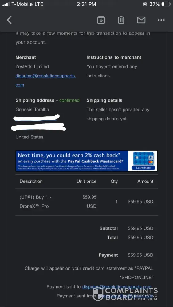 I have ordered two drones about a week ago and still haven't been provided with any shipping details. The ad appeared to be legit and a trustworthy company, but by now I should have been provided with shipping details and a tracking number and have neither. And now that I've looked up ZestAds...I'm not the only they have done this too. I want a full refund.